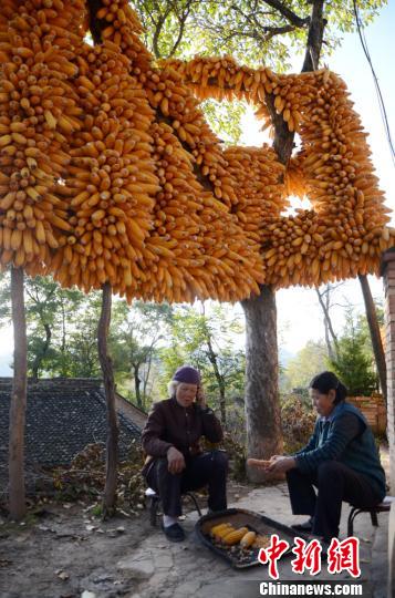 甘肃清水县农民将丰收的玉米挂在屋前的树上晾晒。杨兆康 摄