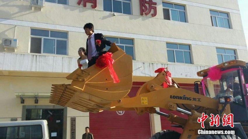 2014年10月14日,陕西省延长县,安先生是一名装载机司机,他带着8台装载机,从延长县七里村镇出发,到十几公里远的郑庄镇迎娶新娘张女士,迎来很多羡慕的眼光。图片来源:CFP视觉中国