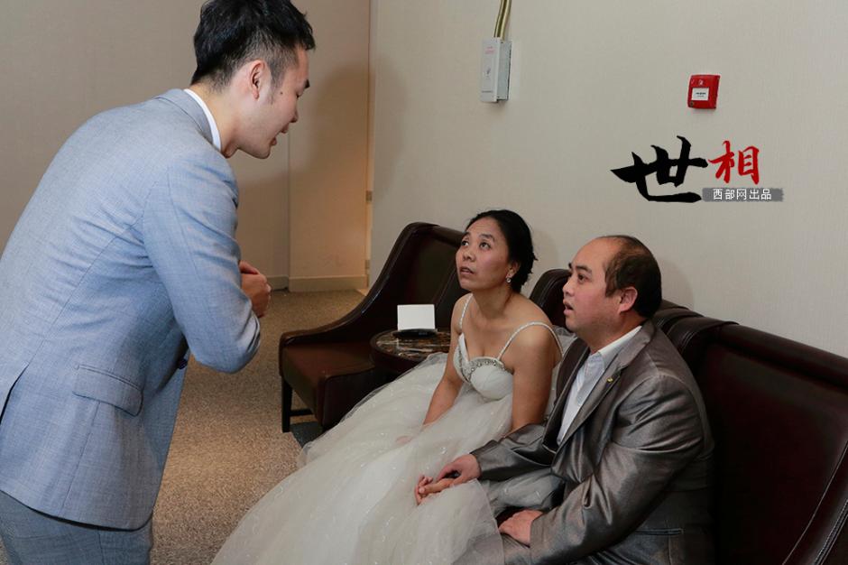 谭福林换上了银色的西装,他笑着告诉记者,这是他这辈子第一次穿西装。而也是人生第一次穿婚纱的郭小宁坐在一旁,不住地问丈夫,西装是什么颜色的,穿着合不合身。