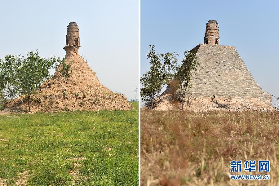 左图:修缮前的山西祁县文峰塔(7月28日摄);右图:修缮后的文峰塔(10月15日摄)(拼版照片)。近日,被网友戏称为“塔坚强”的山西祁县文峰塔修缮完工。建于明清时期的文峰塔是第三次全国文物普查中未核定级别的不可移动文物。此前这座塔呈悬空状的照片走红网络。8月下旬,山西祁县文峰塔正式开始修缮,用时近两月完工。 新华社记者 詹彦 摄 图片来源:新华网