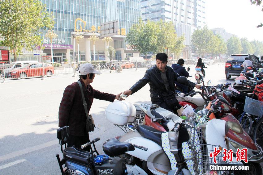 10月15日,郑州闹市区一处公交站牌被几百辆电动车包围。数量众多的电动车,也带动了附近停车员的“生意”。 图片来源:CFP视觉中国
