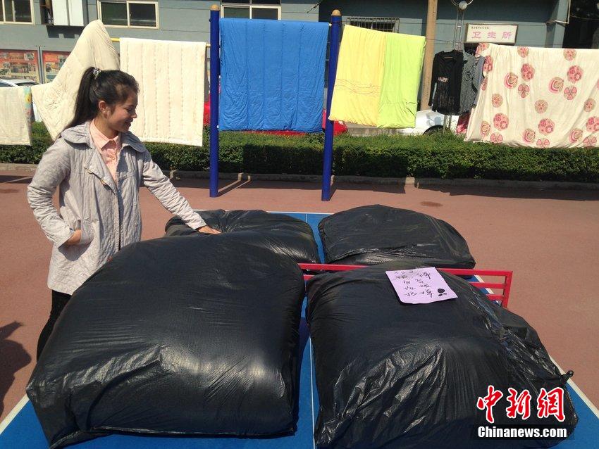 只见三个女同学从宿舍抱来四个黑色大包,放在乒乓球桌上。一旁的同学很好奇,这里面到底是啥?一问才知道,她们把被褥装在黑色塑料袋内密封好,用这种另类的方法晒被子。塑料袋上贴着一张纸条:“302宿舍被褥别当垃圾扔掉,谢谢。”