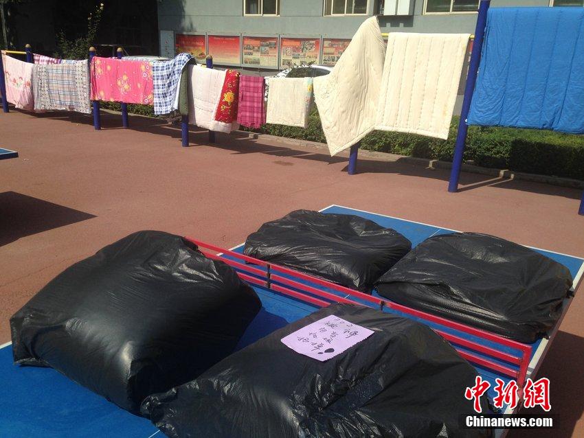 西安,女大学生用垃圾袋晒被子,称温度高可杀细菌。黑色塑料袋里装着3个女生要晾晒的被褥。 图片来源:CFP视觉中国