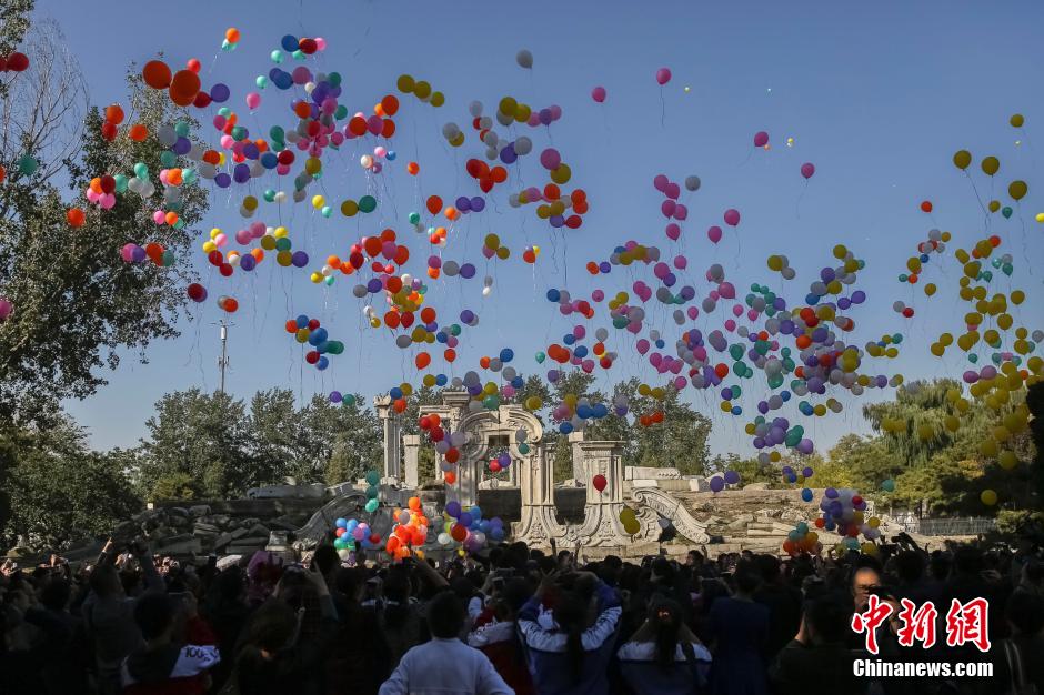10月16日,参加成人礼的学生们放飞气球。当日,在圆明园大水法前,来自北京101中学的600名高中学生在这里举行成人礼。海淀区教委、圆明园管理处及101中学相关领导、老师及家长代表一起参加了活动。中新社发 熊然 摄