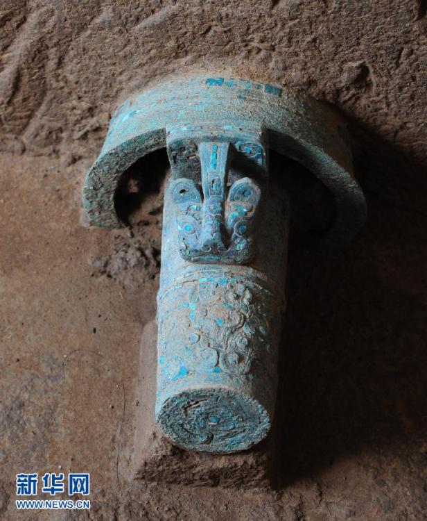 这是“青铜马车”镶嵌着绿松石的车軎(10月14日摄)。考古人员日前在陕西宝鸡市岐山县贺家村的周原遗址考古发现一套豪华的“青铜马车”。经专家初步研究,判断其年代为西周中晚期,其华丽程度在西周车马发展史上堪称“第一豪车”。这套四马驾辕的“青铜车”,是考古人员在20世纪70年代考古发掘的著名凤雏基址南边100余米处意外钻探发现的。目前考古清理工作已发掘至车马坑60厘米处,青铜质地的车辖、车輨、车軎等相继露出,给世人初步展现出西周“第一豪车”的气势。经多位专家确认,这辆西周中晚期的铜马车的木制轮辋外包铜壳,车轮直径约1.4米、周长约4.4米、轮牙宽5.7厘米、厚1.9厘米,个别处见到钉眼、测算重约24公斤。尤其是其兽面纹车軎镶嵌绿松石,甚为精美,在以往商周时期同类形制车发现甚少。参与考古工作的北京大学考古文博学院教授雷兴山认为,重要的是这辆车的车轮是铜的轮牙,这是以往所没有见过的,而镶嵌绿松石的西周时期的车马器也是首次发现。 新华社记者 丁海涛 摄 图片来源:新华网
