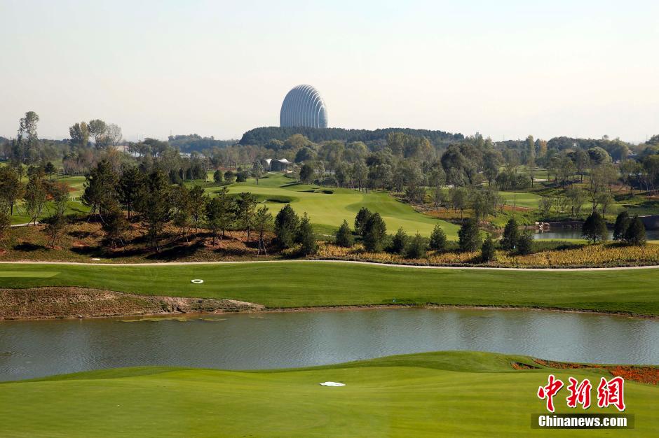 10月16日,远眺雁栖湖“日出东方”酒店。2014年亚太经济合作组织领导人峰会将于11月10日至11日在北京怀柔雁栖湖举行。中新社发 韩海丹 摄