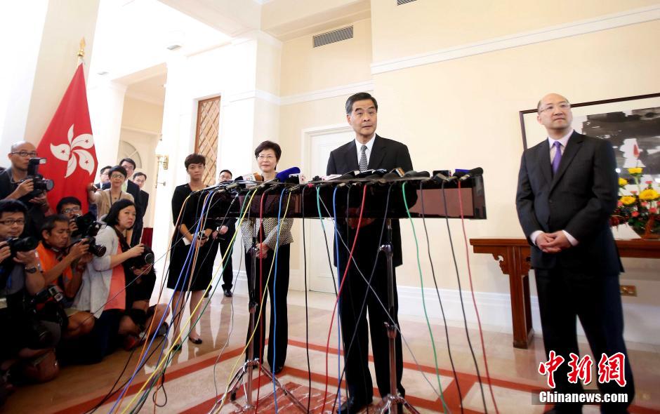 10月16日下午,香港特区行政长官梁振英(中)、政务司司长林郑月娥和政制及内地事务局局长谭志源在礼宾府会见传媒。就有关香港政改方案和目前香港存在的社会问题答记者问。他认为,人大常委会定出的框架,可以令五百万市民一人一票选出行政长官,是香港民主的重大跨越。中新社发 洪少葵 摄