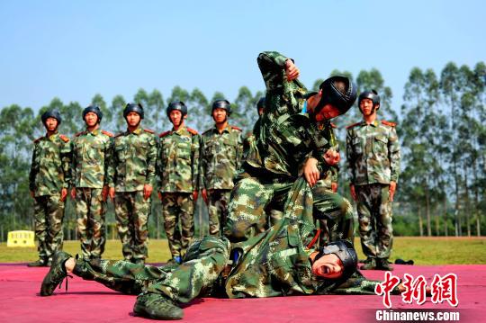 图为武警厦门支队优秀教练员陈振兴进行“挡抓抡摔”擒敌动作示范。李涛 摄