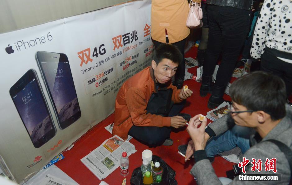 10月16日,山西太原联通营业厅门外,民众排队等待购买iPhone6。