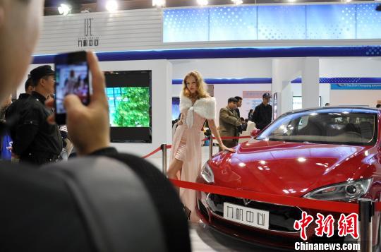 图为开发商将特斯拉超跑开进房交会现场,吸引顾客驻足拍照。张瀚祥 摄