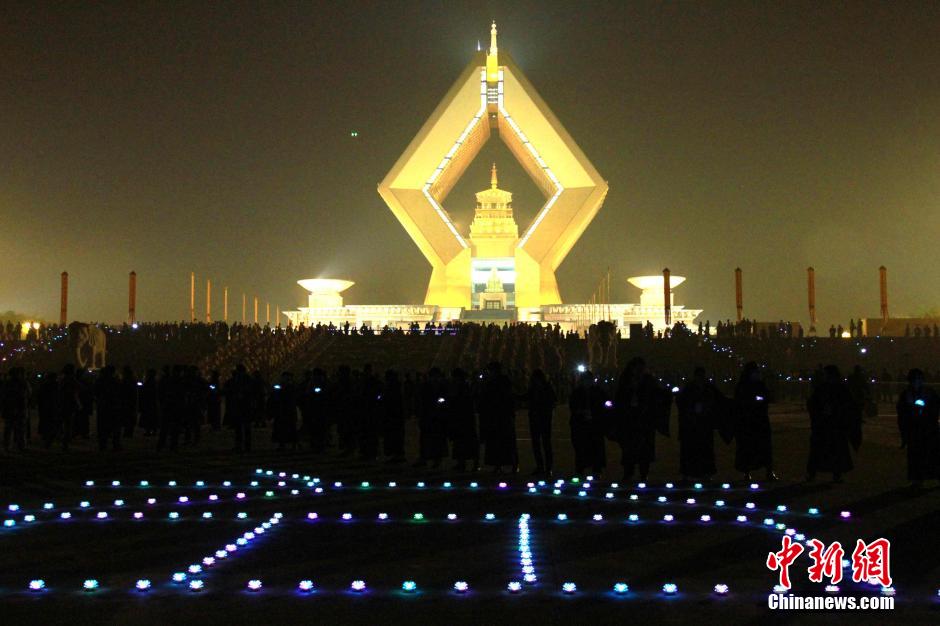 16日晚间,作为第27届世界佛教徒联谊大会活动之一的传灯法会在陕西宝鸡法门寺举行,万余信众点灯祈福。中新社发 张一辰 摄