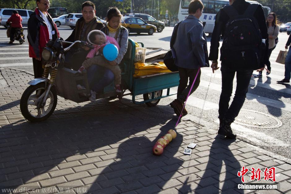 10月16日,北京,新一代苹果手机17日在内地正式发售在即,中国艺术家与朋友在商业区一家苹果专卖店附近马路上遛起苹果和苹果iPhone手机。此前,韩冰曾发起过引起广泛关注的遛白菜活动。这次他们通过遛苹果方式旨在传达日常生活中人们对移动电话的过度依赖。 图片来源:东方IC 版权作品 请勿转载