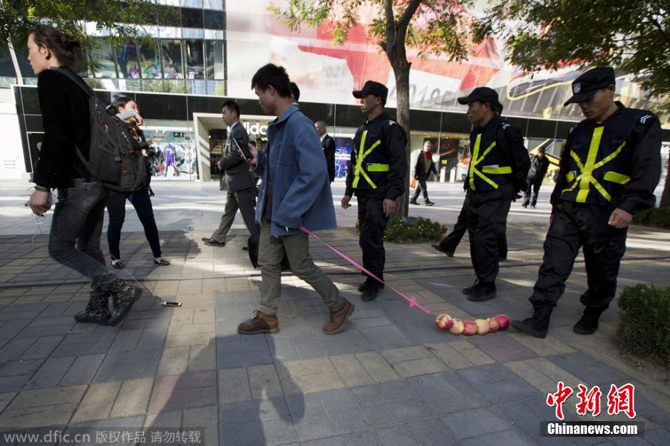 10月16日,北京,新一代苹果手机17日在内地正式发售在即,中国艺术家与朋友在商业区一家苹果专卖店附近马路上遛起苹果和苹果iPhone手机。此前,韩冰曾发起过引起广泛关注的遛白菜活动。这次他们通过遛苹果方式旨在传达日常生活中人们对移动电话的过度依赖。 图片来源:东方IC 版权作品 请勿转载