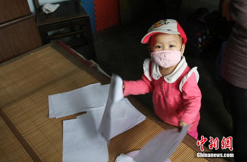 成都市电信南街。“戴假发穿红裙,为白血病女儿筹钱”追踪。图为出租房里玩耍的小雅。 图片来源:CFP视觉中国