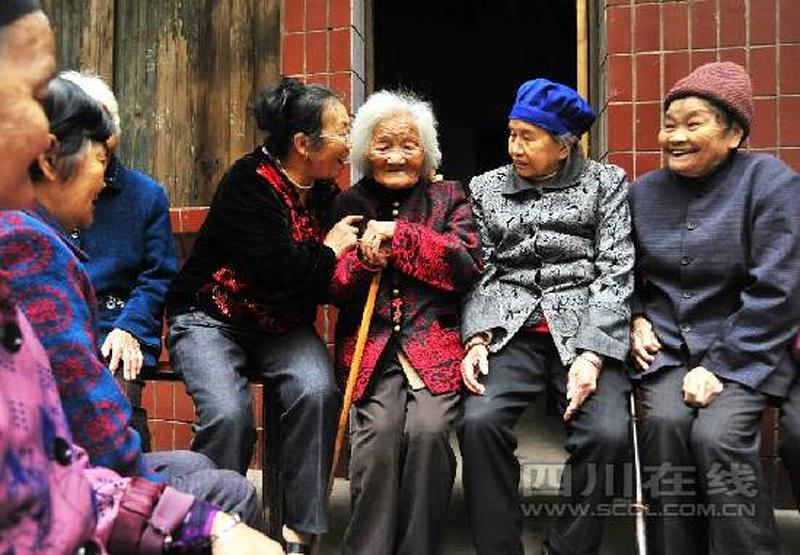 图为一有空她俩就到院坝和其他老人聊天,细心的屈代珍不时凑近老人的耳朵边,告诉她大家聊天的内容,老人听了,笑呵呵的。 陈君 摄 图片来源:四川在线