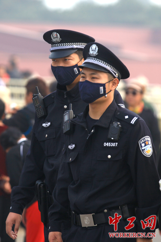图为天安梦广场执勤警察配戴口罩抵御雾霾。 中工网记者 李雪峰 摄