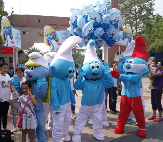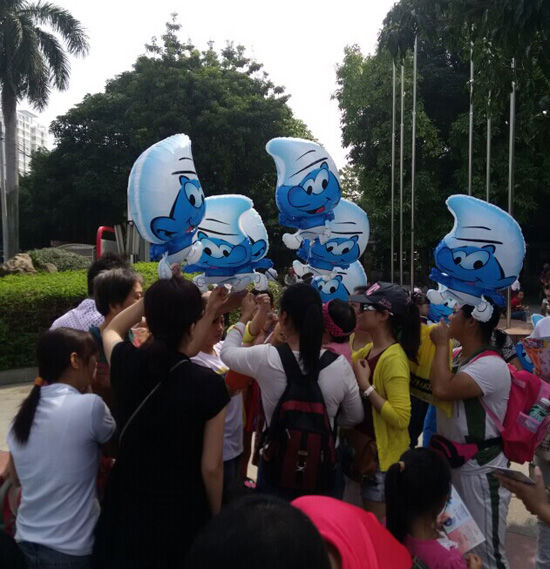 大家纷纷抢着跟蓝精灵照相