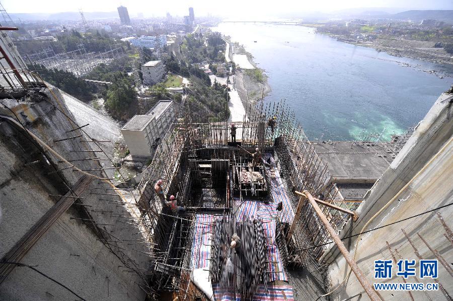 正在进行施工的丹江口大坝(2010年3月25日摄)。 新华社记者 郝同前 摄