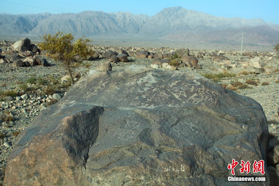 近日,新疆哈密黄田农场庙尔沟村发现疑似吐火罗语文字岩刻,岩刻与吐火罗语的文字笔画结构接近。吐火罗语和公元前1400年左右流行于小亚的语组的赫梯语关系尤为密切,可能是最古老的印欧语系的语言之一,也是大月氏人使用过的文字之一。图为哈密庙尔沟带有文字的岩石岩刻。图片来源:CNSPHOTO 中新社发 彭兴礼 摄