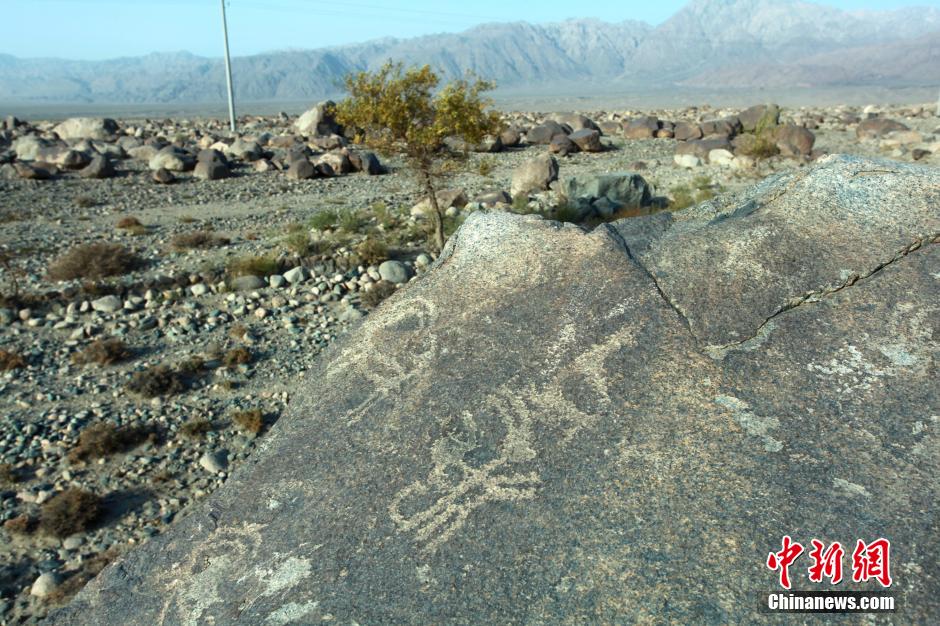 近日,新疆哈密黄田农场庙尔沟村发现疑似吐火罗语文字岩刻,岩刻与吐火罗语的文字笔画结构接近。吐火罗语和公元前1400年左右流行于小亚的语组的赫梯语关系尤为密切,可能是最古老的印欧语系的语言之一,也是大月氏人使用过的文字之一。图为哈密庙尔沟带有文字、岩画的岩石。图片来源:CNSPHOTO 中新社发 彭兴礼 摄
