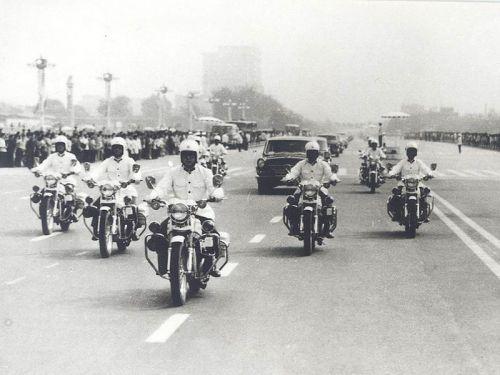 1954年6月,中央人民政府下令在迎送外国元首仪式中增设国宾车队摩托车护卫队,骑手由北京市公安局的民警担任。1966年至1980年,摩托车护卫队一度被取消,1981年重新恢复,2004年1月1日再次取消。图为1982年国宾摩托护卫队执行迎宾任务。