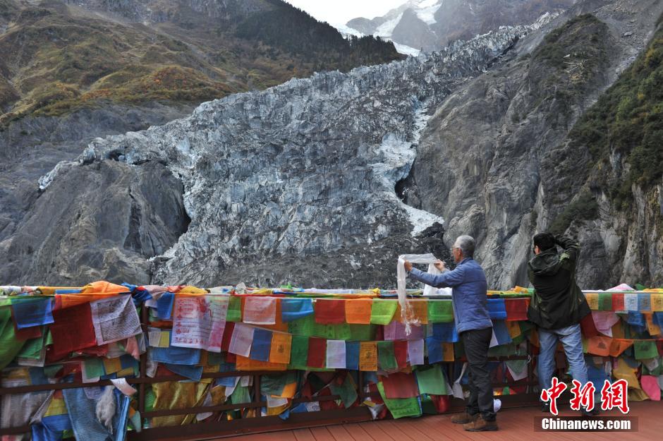 10月21日,游客在冰川前献上哈达。据当地民众介绍,自从全球气候变暖以来,梅里雪山明永冰川逐年削减。据报道,明永冰川正在以每年50米左右的速度后退,科学家认为,其主要原因在于全球气候变暖,退化难以遏制。明永冰川是云南省最大、最长和海拔最低的山谷冰川,山顶冰雪终年不化。中新社发 任东 摄