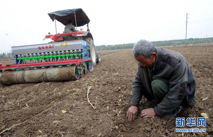 10月22日,河北文安县苏桥镇崔家坊村农民在察看播种机作业情况。近日,河北各地抓住晴好天气及时整地备耕,在冬小麦适播期内适度播种,提高播种质量。 新华社记者 李晓果 摄