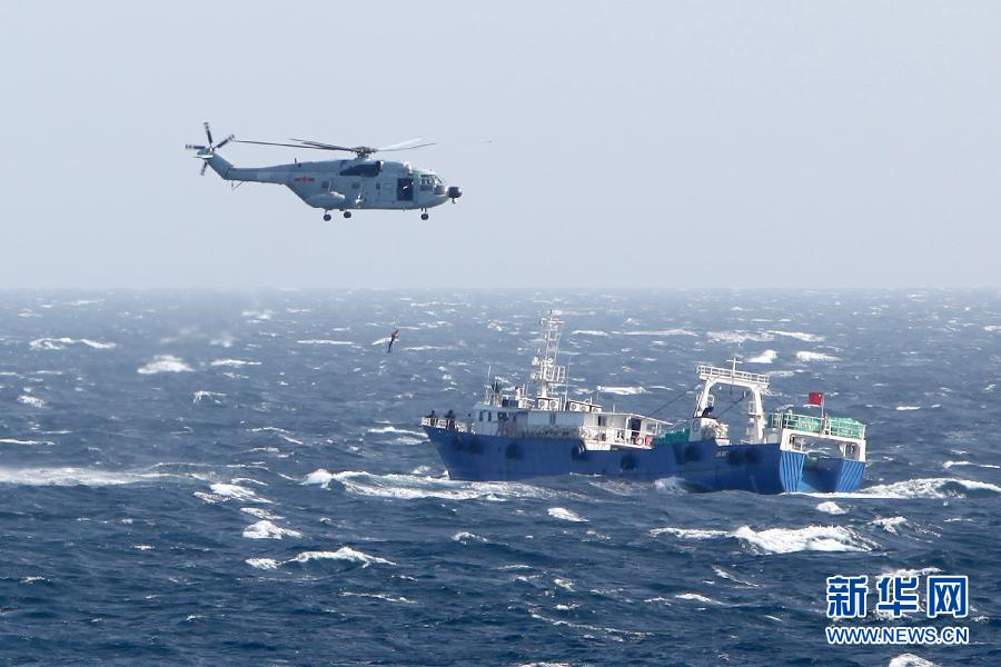 10月21日,舰载直升机将一名救生员吊放至渔船。