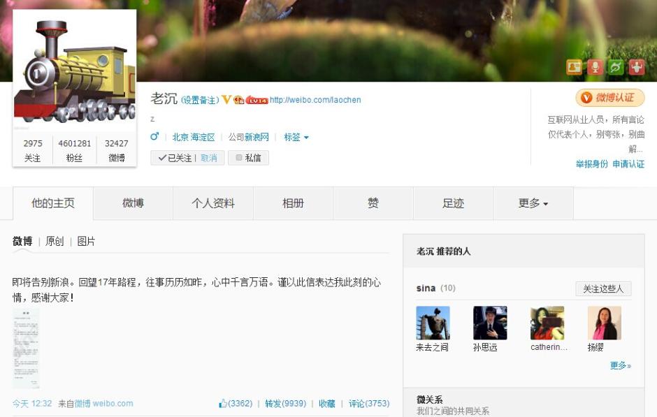 10月22日中午,新浪执行副总裁,新浪网总编辑陈彤在微博中透露,因个人原因将于近期离职。根据新浪CEO曹国伟内部邮件透露,陈彤今后仍将担任新浪的发展顾问。图片来源:陈彤认证微博