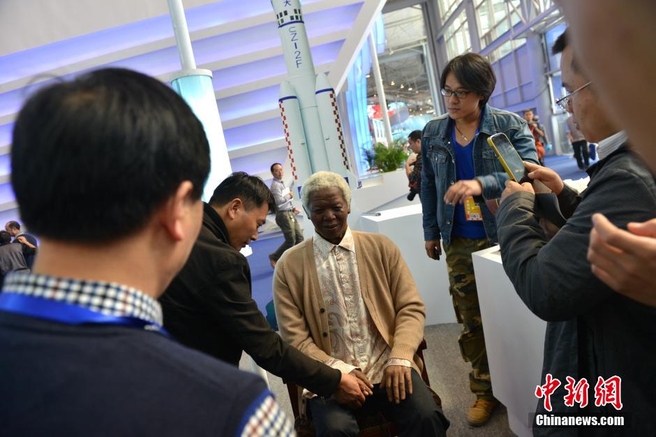 10月23日,第15届西博会在成都启幕,本届共吸引76个国家和地区的近9000家企业参展。图为西博会上亮相的一台以南非前总统曼德拉为形象塑造的机器人,除了丰富的人物表情外,机器人还能与观众进行简单对话。 张浪 摄