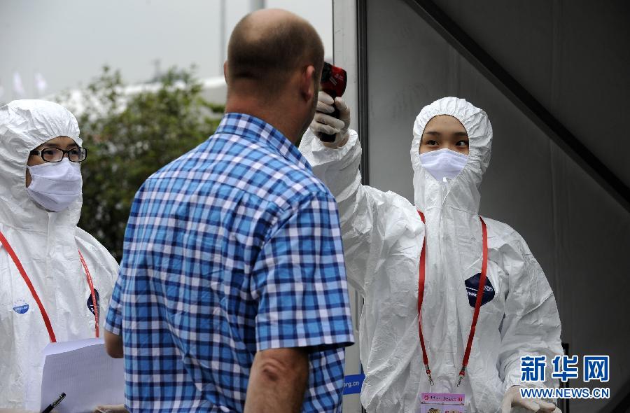 10月23日,大会卫生保障办的志愿者为进入展馆的人员测量体温。当日,第116届广交会二期开幕,大会埃博拉疫情防控举措进一步升级,所有入场人员均要接受红外线体温探测,如果显示体温超过37.5度,现场工作人员将用水银体温计再次测温并向大会卫生保障办报告,体温超标者将被送往指定医院接受后续检查。新华社记者 梁旭 摄