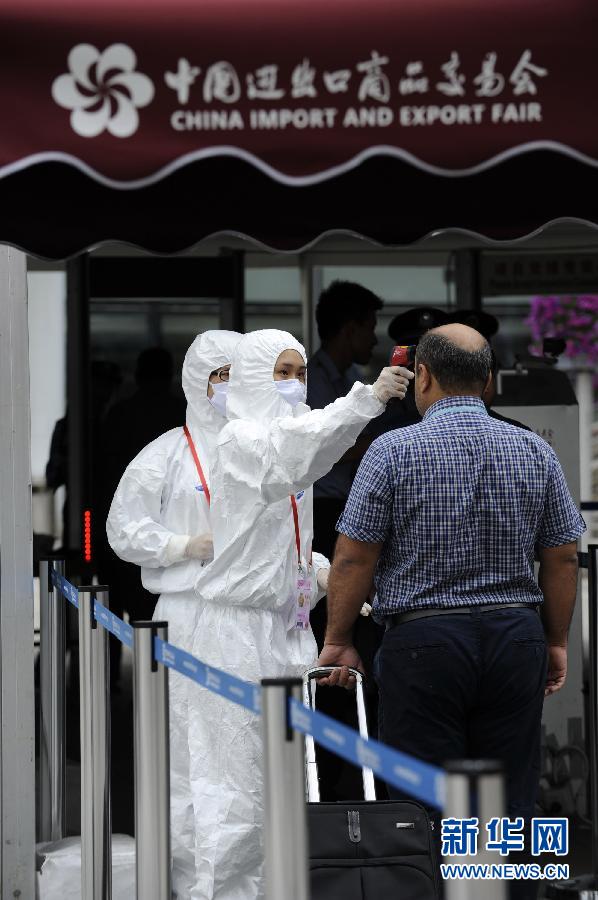 10月23日,大会卫生保障办的志愿者为进入展馆的人员测量体温。当日,第116届广交会二期开幕,大会埃博拉疫情防控举措进一步升级,所有入场人员均要接受红外线体温探测,如果显示体温超过37.5度,现场工作人员将用水银体温计再次测温并向大会卫生保障办报告,体温超标者将被送往指定医院接受后续检查。新华社记者 梁旭 摄