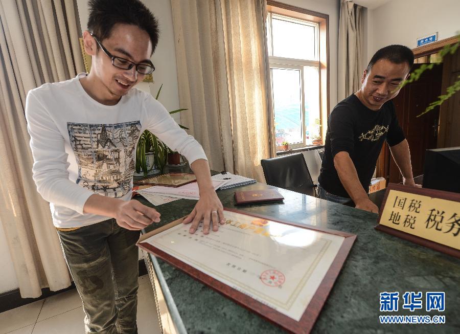 10月23日,濮院镇物流园区的王治进(左)在桐乡市工商局濮院工商分局办理工商营业执照和税务登记证。 2014年8月,国务院发布了《关于取消和调整一批行政审批项目等事项的决定》,将31项工商登记前置审批事项改为后置审批,大大缩短和简化了工商登记的流程和时间,方便了经营户快捷办理工商营业执照。据浙江桐乡工商局工作人员介绍,在行政审批项目调整之前,至少需要5天才能办理好工商执照和税务登记证,而现在只需要几个小时就能现场办理好并拿到所需的证照。新华社记者 徐昱 摄