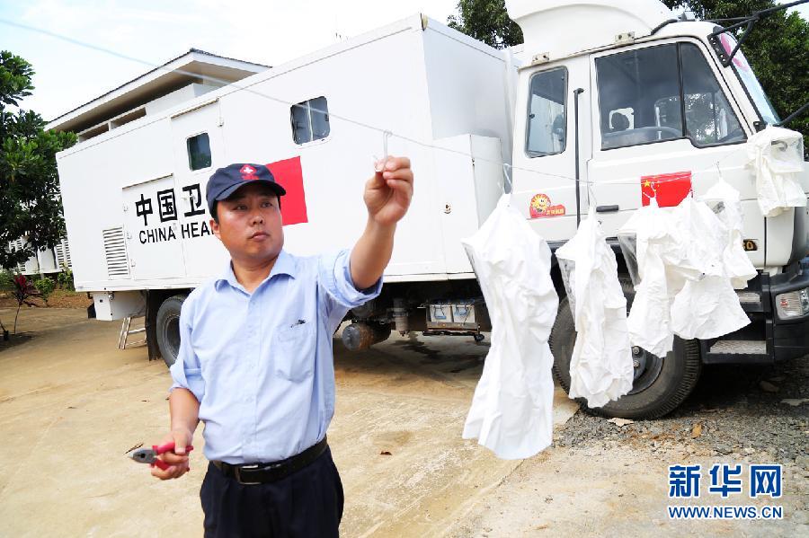 10月1日,在塞拉利昂首都弗里敦,中国疾控中心赴塞移动实验室检测队队员准备为防护用具消毒。当地时间9月17日凌晨,中国疾控中心59名工作人员抵达塞拉利昂首都弗里敦隆吉国际机场。据移动实验室检测队介绍,自9月28日检测队第一次接检24例埃博拉病毒样本以来,截至10月22日,检测队已累计接检样本666例,其中阳性样本378例。塞拉利昂卫生部门的报告说,中国实验室公布的检测结果无一差错,准确率达到100%。 新华社发(郝杨力摄)