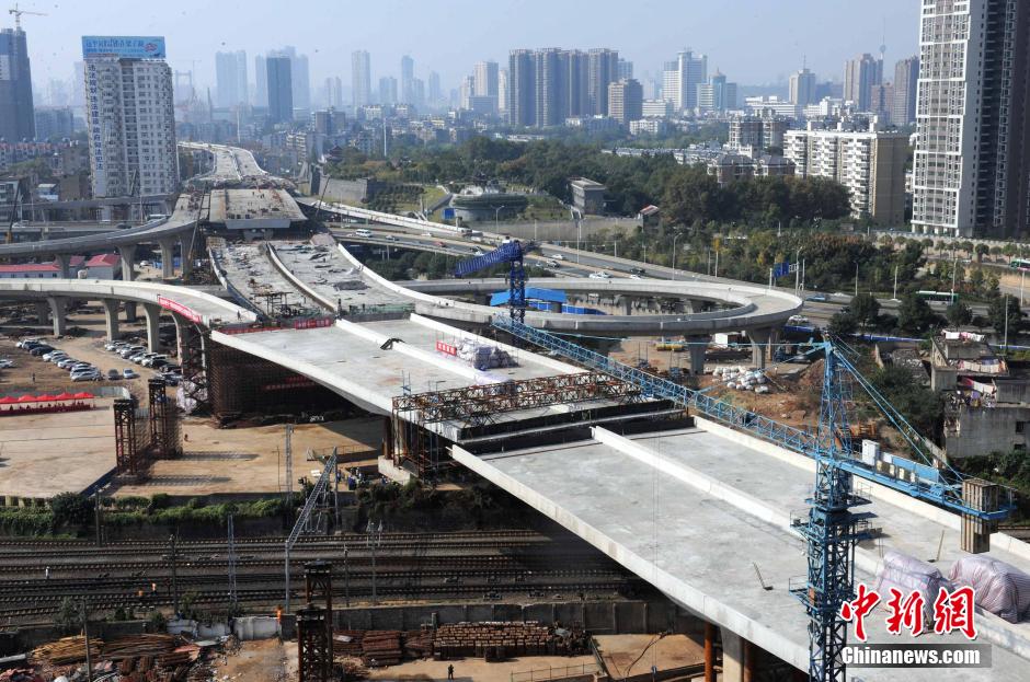 10月24日,武汉鹦鹉洲长江大桥南岸接线上,梅家山立交跨铁路长185米的重达11000吨箱式转体桥在京广铁路大动脉上空顺利完成两次转体作业后合龙。据武汉铁路局介绍,这是继今年1月14日武汉姑嫂树路高架跨铁路桥成功转体后又一跨铁路桥成功转体范例。据悉,在不影响铁路正常运输的情况下实施两次转体作业,这在横跨铁路桥梁建设中尚属首次。中新社发 郭海生 摄
