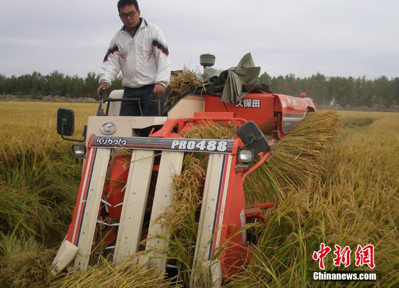 近日,由国家农业部科教司、农业机械化管理司组织,由中国工程院院士陈学庚研究员任组长的一行10人专家组,对在新疆生产建设兵团第一师一团种植的146亩“水稻机械精量旱穴播技术与机具”示范田进行了精准测产验收,最后确定这146亩示范田水稻亩产创1042.97公斤高产的全国最高纪录。图为在农业部专家组现场监督下现场收割146亩水稻的场景。王新卫 摄