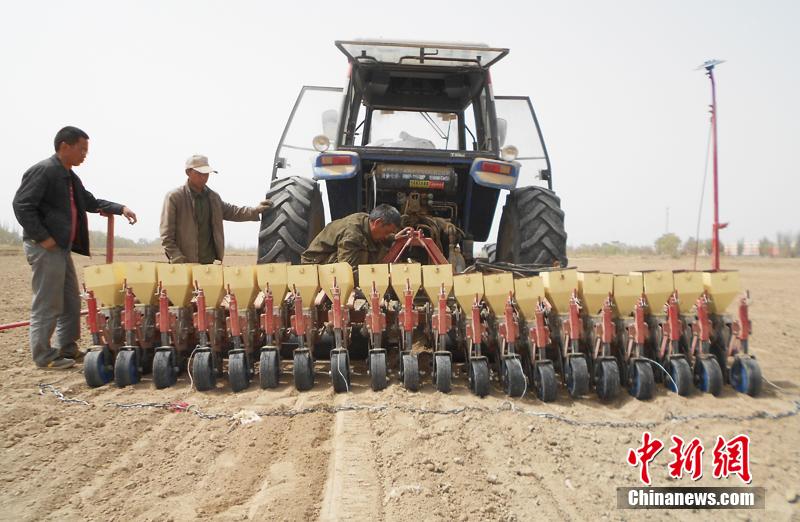 近日,由国家农业部科教司、农业机械化管理司组织,由中国工程院院士陈学庚研究员任组长的一行10人专家组,对在新疆生产建设兵团第一师一团种植的146亩“水稻机械精量旱穴播技术与机具”示范田进行了精准测产验收,最后确定这146亩示范田水稻亩产创1042.97公斤高产的全国最高纪录。图为一团采取机械精量旱穴播技术播种水稻的场面。王新卫 摄