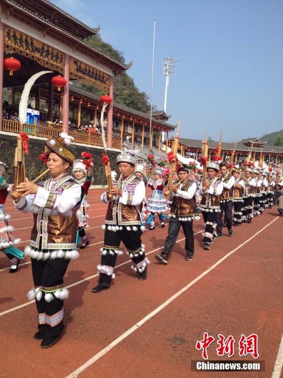 10月25日,素有“百节之乡”的广西融水苗族自治县举行芦笙斗马节。在开幕仪式现场,举行了传统的苗族芦笙祭祀仪式,芦笙三部曲芦笙迎宾曲、进村曲、芦笙踩堂,千人广场舞表演、200名“芒蒿”庆丰收的盛大场景表演成为此次开幕式的压轴“大戏”。“芒蒿”是苗语译音,“芒”是面具之意,“蒿”指神灵。廖子渊 摄