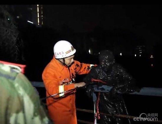 2014年10月22日晚上9时许,安徽省芜湖市弋江区一名男子在酒醉后不慎落入一污水粪池中,幸运的是污粪塘并不深,只淹到男子头颈部位,清醒后的男子大声呼救,路过的市民群众及时发现,将一条绳子递给他,男子无力爬上岸,群众立即报警,辖区派出所民警和弋江消防大队迅速赶到现场,男子最终被成功救援上岸。图片来源:央视网