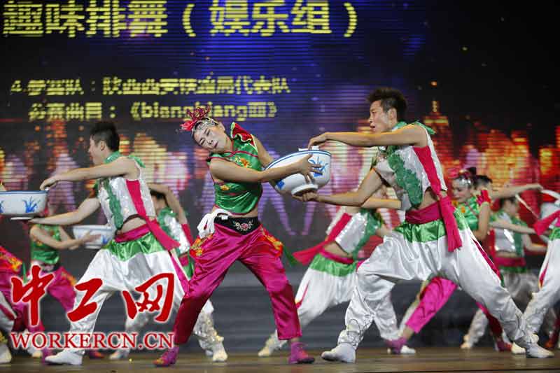 在大赛中,各代表队在舞蹈的编排上别出心裁,把具有地方特色的元素融入到编舞中,使人眼前一亮。图为陕西省西安铁路局的作品《biangbiang面》。中工网记者韩靖摄
