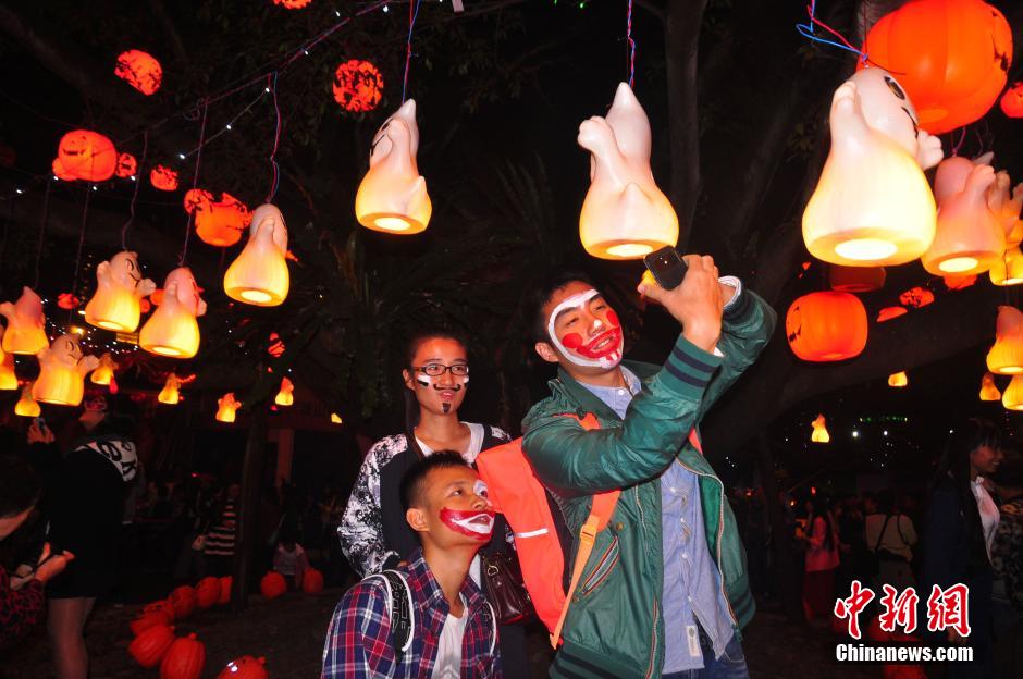10月31日,是西方的“万圣节” ,桂林伏波山景区举办万圣节主题活动。入夜,万盏南瓜灯和卡通灯在景区齐放,桂林市民和中外游客把自己打扮成各式各样的卡通人物,观看表演,参加互动游戏。中新社发 唐梦宪 摄