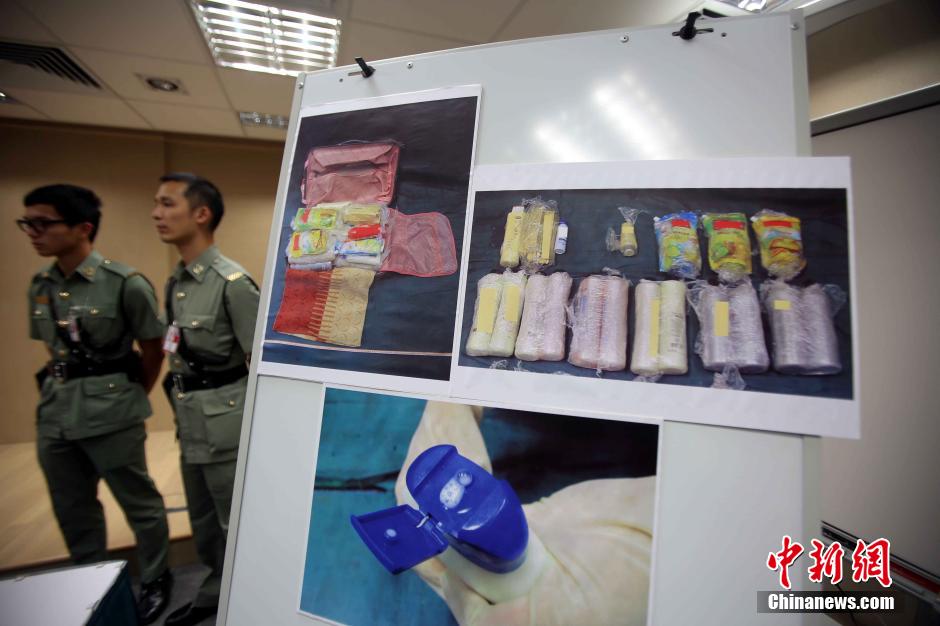 10月31日,香港机场科航空旅客及停机坪课监督伍境康在记者会上讲述截获逾2千万港元毒品“可卡因”经过。海关30日在机场检查一名从秘鲁经荷兰抵港女子的行李,发现20瓶不同品牌的护发用品及3包食物酱料,检查后发现藏有约20公斤液态可卡因毒品,市值超过2千万港元,随即拘捕31岁女子。中新社发 洪少葵 摄
