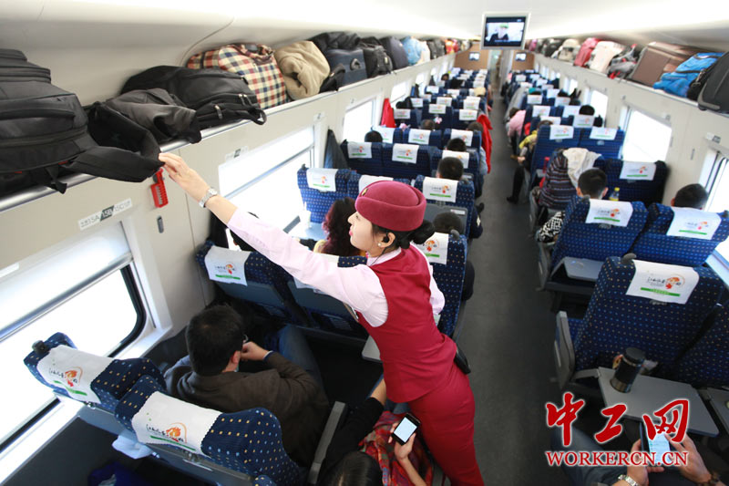 图为乘务员规范摆放旅客行李。 中工网记者 韩靖 姚星报道