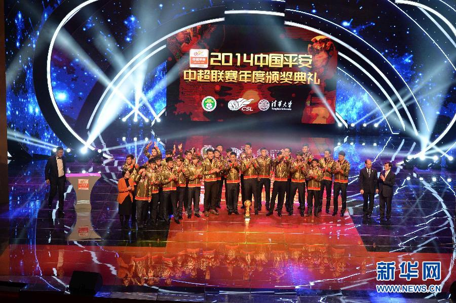 11月6日,广州恒大队球员在颁奖典礼上。当日,2014中超联赛年度颁奖典礼在北京清华大学举行,广州恒大队捧得中超冠军奖杯。 新华社记者郭勇摄