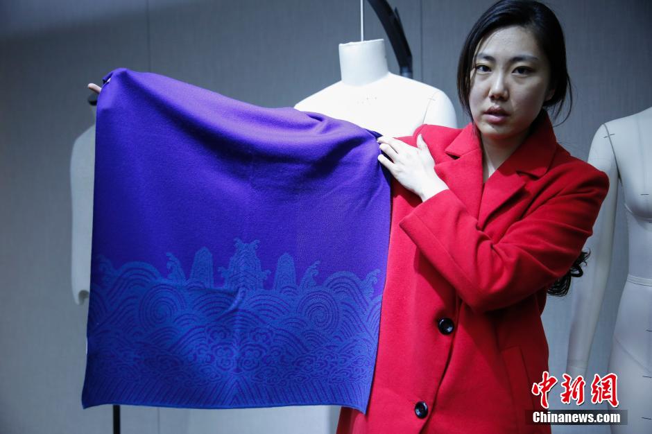 11月10日晚,中国国家主席习近平和夫人彭丽媛在北京为出席亚太经合组织(APEC)第二十二次领导人非正式会议的各经济体领导人及配偶举行欢迎晚宴。晚宴开始前,各经济体领导人夫妇身着特色中式服装合影。图为领导人佩戴的围巾。中新社发 王骏 摄