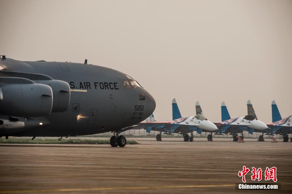 11月10日,美军C-17在暮色下缓缓进入珠海航展展位,不远处是俄罗斯勇士飞行表演队的苏-27战斗机群。中新社发 龙宇阳 摄