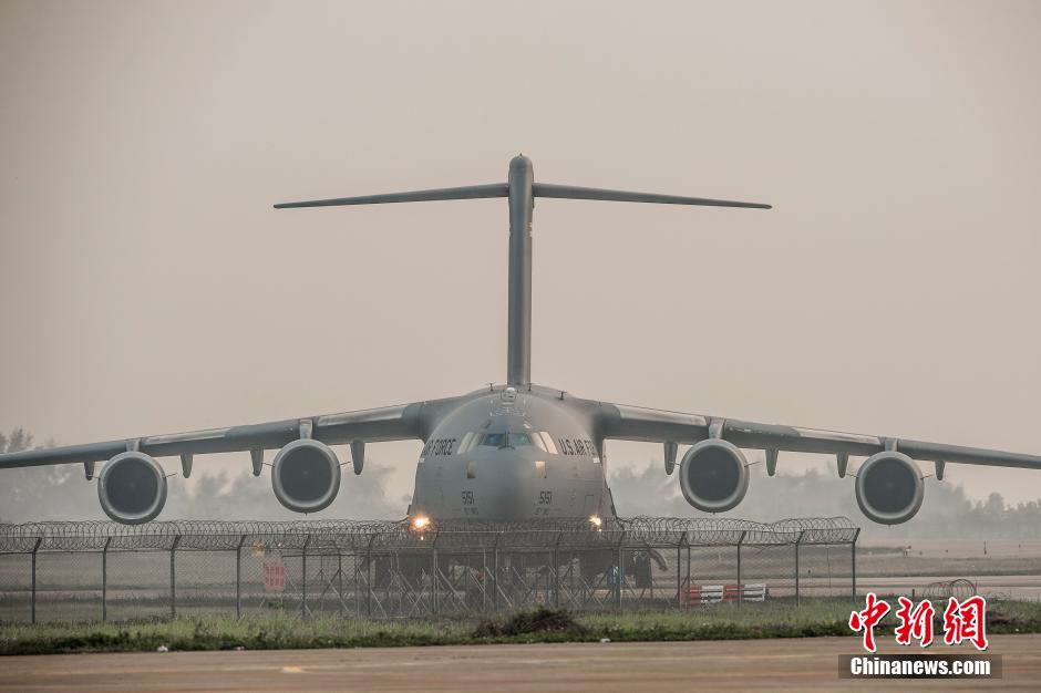 11月10日,美军C-17在暮色下缓缓进入珠海航展展位,其庞大的机身吸引了周边不少好奇的目光。中新社发 龙宇阳 摄