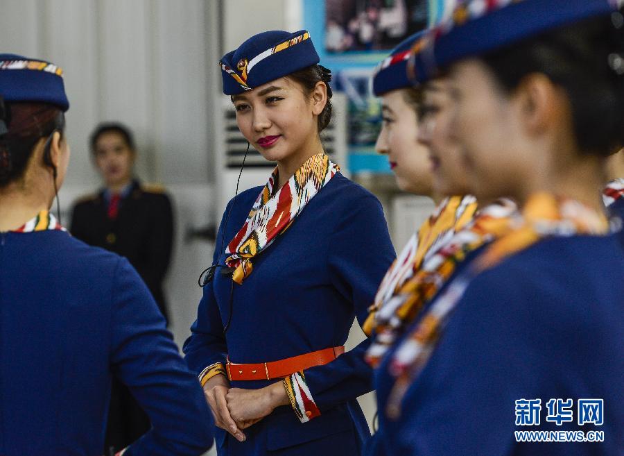 11月10日,乌鲁木齐客运段动车队的“动姐”代丹(左二)在模拟向旅客介绍动车乘坐须知。新华社记者 赵戈 摄