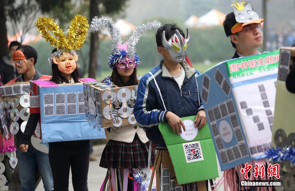 11月12日,在南京理工大学举办的江苏省理工类大型招聘会上,该校大学生读者协会的大学生们利用废旧的纸盒、光盘等物品,以“就业童话”为主题制作了十多个可移动的卡通动物、超人、神话人物等,用近300个可扫描下载的图书二维码拼接出“助推就业”等字样,开展“移动&Show图书馆”真人秀,在神曲“小苹果”的音乐中玩快闪。据了解,移动图书馆是专门为图书馆制作的移动阅读平台,读者可在手机、平板电脑等移动终端上自助完成个人借阅查询、馆藏查阅、图书馆最新咨询浏览,同时拥有超过百万册电子图书、海量报纸文章以及中外文献元数据供用户自由选择,为读者提供方便快捷的移动阅读服务。 泱波 摄