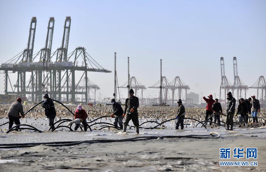 施工人员在围海造陆现场施工(11月12日摄)。据了解,截至10月31日,天津东疆保税港区共有各类企业2834户,注册资本达1547.45亿元,新注册企业和工程建设正在加速。天津东疆保税港区位于天津港东北部,为浅海滩涂人工围海造陆形成的三面环海半岛式港区,总面积约30平方公里,全部建成后将具备集装箱码头装卸、集装箱物流加工、商务贸易、生活居住和休闲旅游等功能,致力于打造成中国北方国际航运中心和国际物流中心。新华社记者岳月伟摄